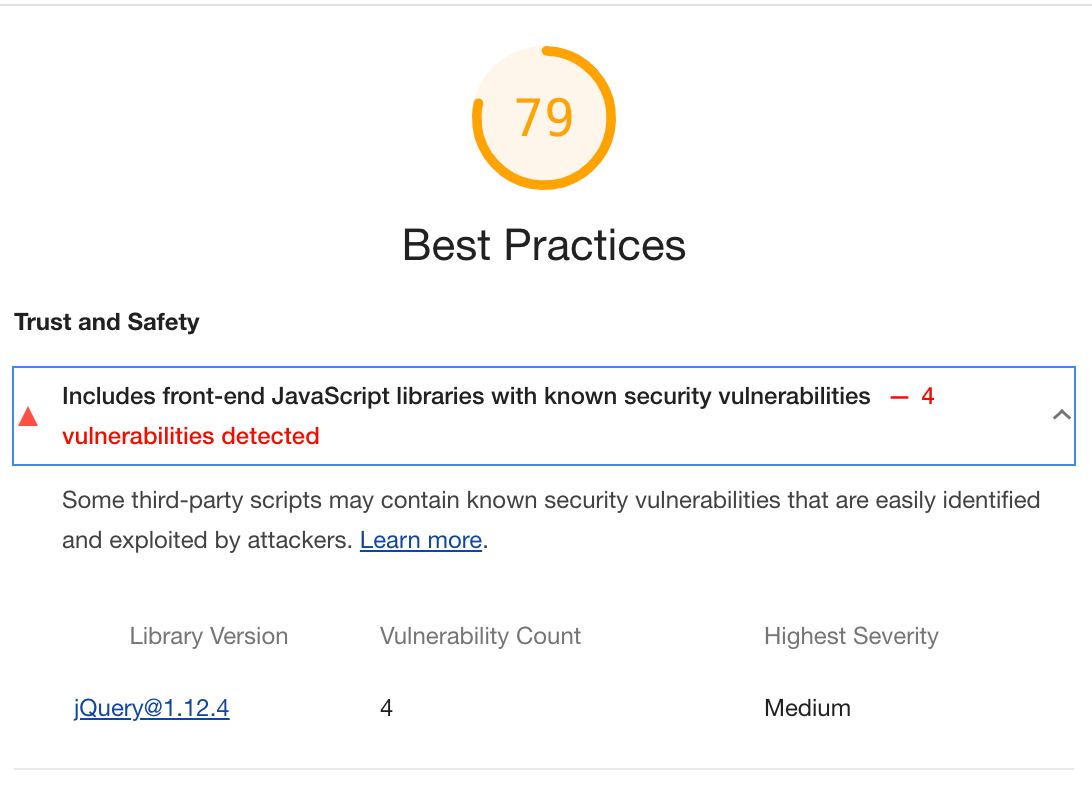 Lighthouse ругается на Jquery 1.12.4, которая содержит 4 уязвимости среднего уровня.
