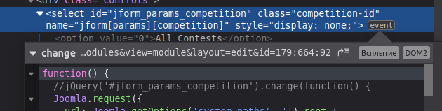document.getElementById('jform_params_competition').addEventListener('change', function() {console.log('change');}); ничего