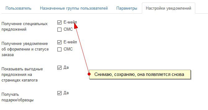 Теперь вопрос: как добиться того, чтобы по умолчанию ставился email, но при снятии галочки и сохранении пользователя галочка оставалась бы снятой?