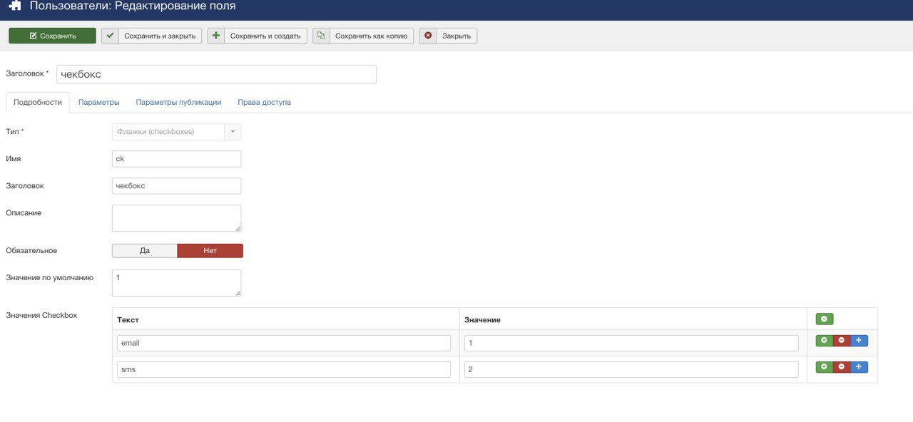 Столкнулся с интересным поведением настраиваемого поля Jooma - checkboxes. Задаю такие настройки(см. скриншот). По умолчанию должен быть установлен email. Это работает. НО. Если я захожу в пользователя и снимаю обе галочки, а потом сохраняю пользователя (поле для пользователей), то Joomla снова ставит по умолчанию галочку для email.
