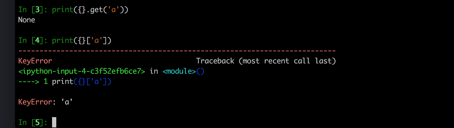 dict.get(key[, default]) - возвращает значение ключа, но если его нет, не бросает исключение, а возвращает default (по умолчанию None)
