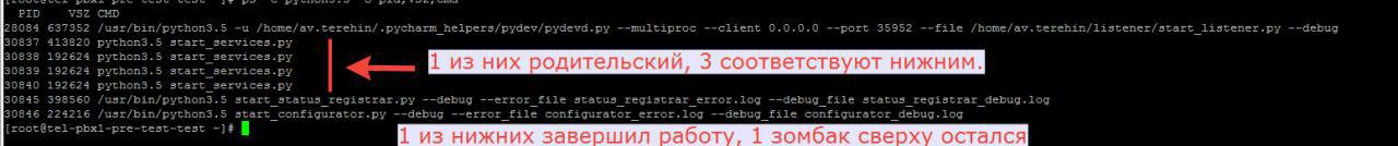 Пример: скрипт запускает 3 службы, 1 завершает работу. Остается зомбак с именем родительского процесса. Почему может быть так?