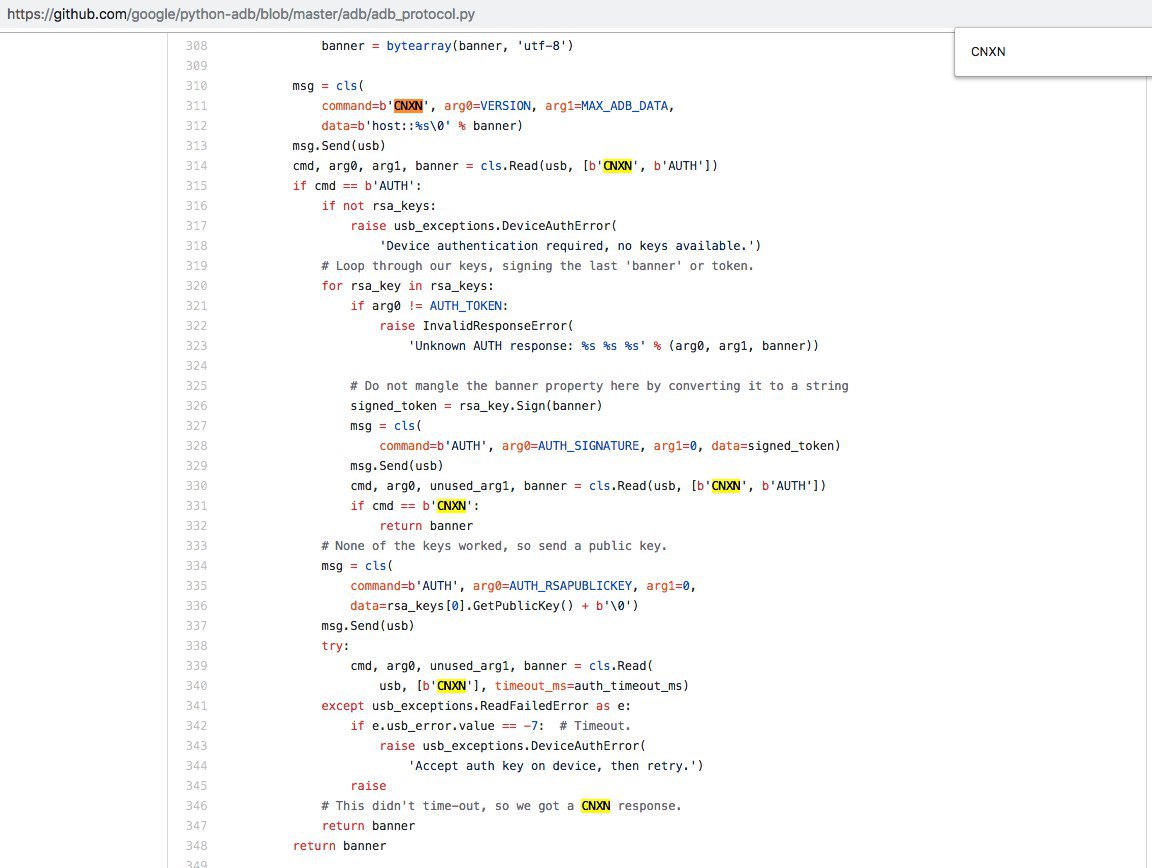 Скриншот не моего кода. Я просто пискал по гиту "b'CNXN". И вот что нашлось. Вот и спрашиваю