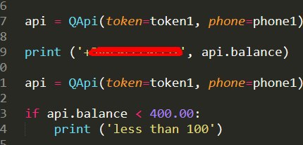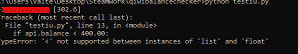 использую simpleqiwi, нужно сравнение api.balance с числом, но при запуске ругается на сравнение списка и числа, хотя сам апи.баланс сверху (302.6) спокойно отображался. Как получать эти самые 302.6 но уже для сравнение с 400.00?