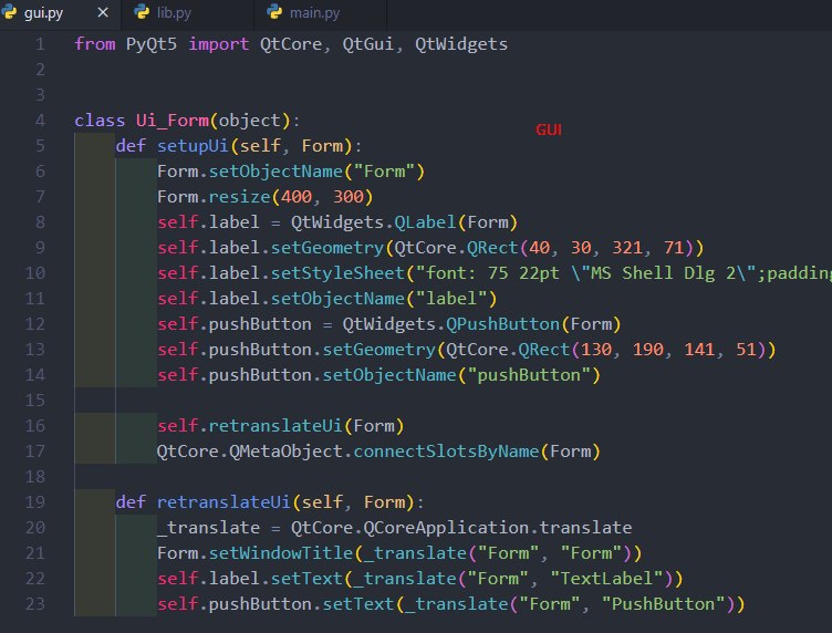 Настраиваю PyQt5. Есть 3 файла. gui.py, main.py, lib.py. Как правильно импортировать main в lib для того, чтобы можно было пользоваться объектом ui из файла main и писать функции и как правильно взаимно импортировать lib в main для того, чтобы потом в main пользоваться этими функциями из lib?