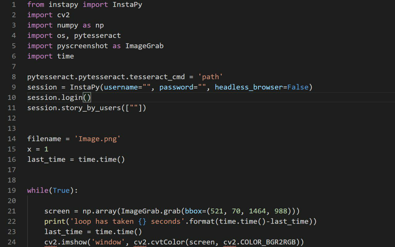 Всем привет, пишу скрипт для распознавания текста в сториз инсты, проблема в том, что это все в реальном времени и бот скринит не в момент просмотра истории, а ранее, если сделать sleep() перед циклом, то успеет схватить кадр, но не распознается текст, что я делаю не так?