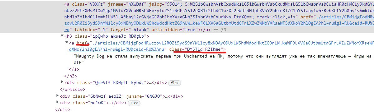 Всем привет. Нужна помощь в парсинге гугл новостей. Как можно спарсить заголовки статей и ссылки? Значение атрибута jslog всегда разное
