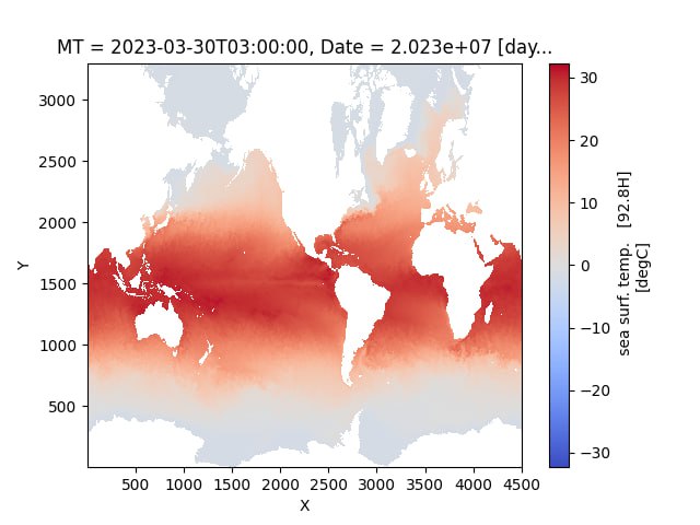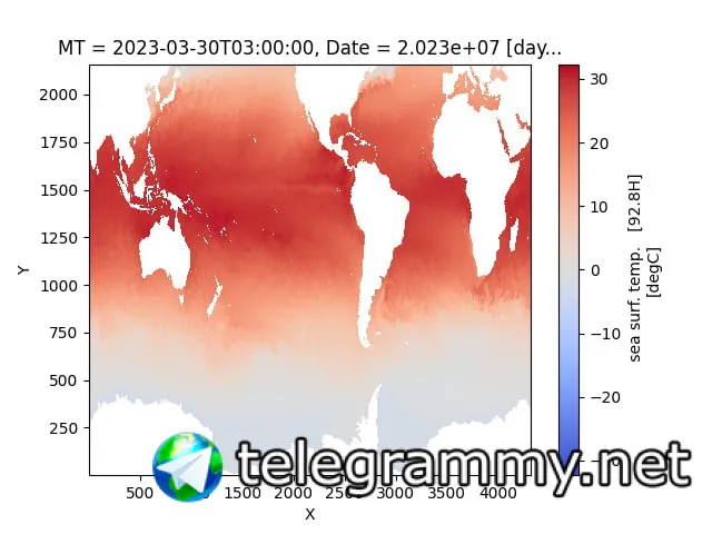 Господа, подскажите, я использую XArray для работы с NetCDF, сам NC с сервера NOAA (скачать), мне нужно интерполировать его по координатам X и Y, делаю так: da.interp(X=np.arange(1, 4320, 1, dtype=int), Y=np.arange(1, 2160, 1, dtype=int)), а на выходе (рисую через mathplot) получаю какой-то обрезанный датасет, ниже прикреплю два скрина, первое это какой изначально датасет, а второе - то, что получилось при интерполяции, а мне надо как изначальный, только интерполированный в меньшее кол-во точек