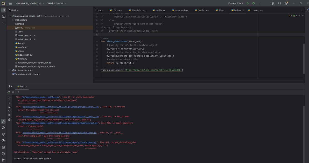 Всем привет. Написал функцию по скачиванию видео с ютуба. Но почему-то всплывает ошибка. Использую библиотеку pytube