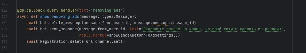 Всем привет. У меня возникает конфликтная ситуация, при нажатии кнопки "Удалить", бот отправляет сообщение 'Отправьте ссылку на канал, который хотите удалить из рекламы' и снизу кнопка "Отмена" для возврата в меню, Проблема в том, что при нажатии на кнопку "Отмена" ничего не срабатывает. Я так понял из-за await Registration.delete_url_channel.set(). Когда я убрал эту строку, то всё заработало. Как мне обойти этот конфликт?