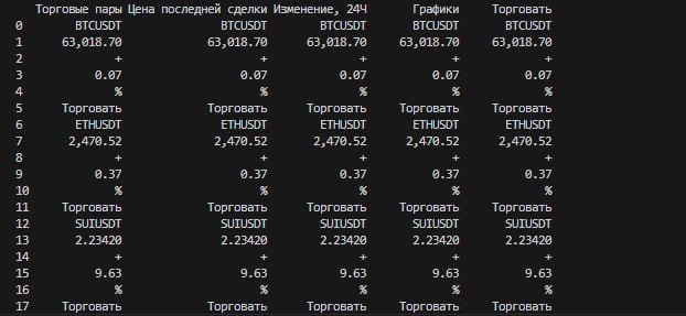 как правильно перестроить таблицу? нужно, чтобы 1 строка стала 1 столбцом и т.д. btc, eth под торгвой парой, цена под ценой... я пробовал через индексы, но получилось еще хуже