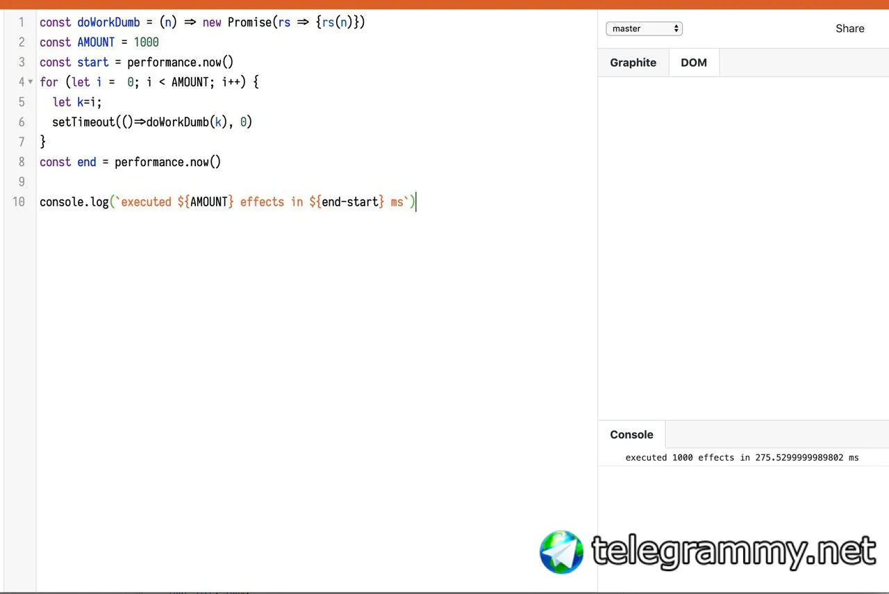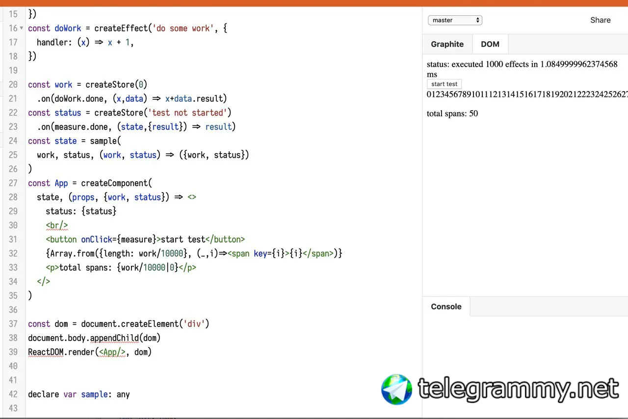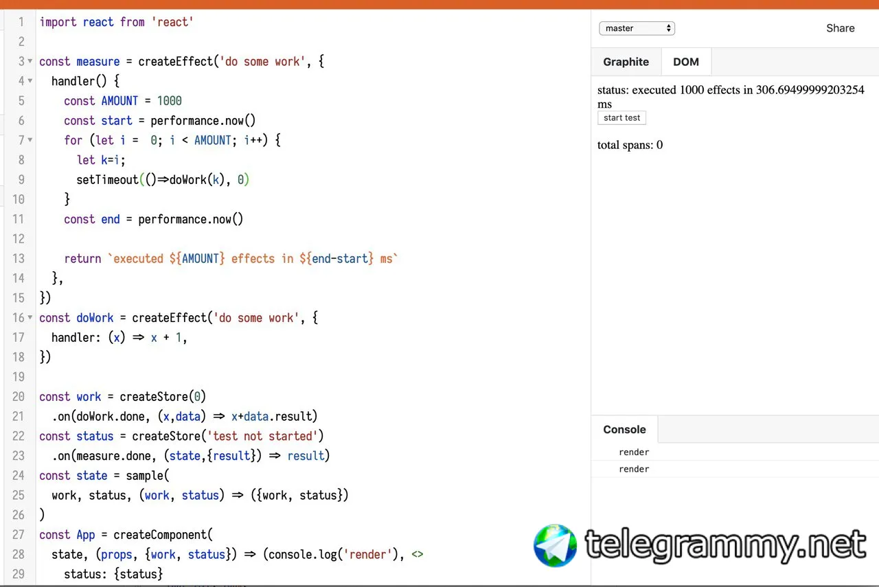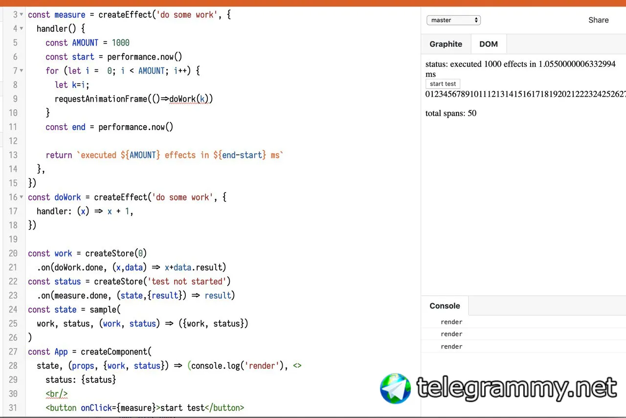 https://effector.now.sh/try?version=master&code=JYWwDg9gTgLgBFApgQwMbwGZQiOByJNGPAKFEljgCUV0ARAeQFk4sd9D0BaAEx1PLR4Ab1SEYiAKIYMidABo4YlBIDKMaIkUBnZOAA2iAL6tsuPIhlyNUAeCFxR4xAGEckAHaIPME23OWsujQXJzEJCSoEB7a8CAo2gCuSHAAvErO0kEwABR4fHDaOIhwAO7QANZ4isIkcHAAFsgePIZQOQCUjnX1StGxcACCTAwAqgByACppcABMAAyL8z31UTHwsciU6WCIUBjQIM2oiAB0HhClnSus0HA5hvDAM3DzANxwzwA8QyMTkx9gABqIFdPgAdUqOWAHRuawG3h4M12+0OxzOFyusJuSBgyQ8cAABogAB5yRISJEAEmEwzGUxMgWs2k+BJpiK4m1gJhA2kJPSM8hIRlh8PgEMqM2UyAkWWseQKRXiZUq1W69SaLTaAC57iSuqkAHxwElwIFwACMQpFETFKqgFSlznUmhy81h9VO0RyEodpz4XkUORJ8h4MuQBuNJKBYZgyFOSCS+hgov6GzjeJZ6WlahsiDyEgGF3TW0peFhAEgvR4cvFkEkkP7olp7psJPJhInEsmRWljV3k6n1oUMyV0roDPmeuUHToM4ltEGZxU5zKF5H7sJl6vMzahwNBmAwE6VK53M2fDkem2WzkwNgwIvHNuR2vtL2jXAvoabm2F7rhD-d8bi+AAjKAAHof16L9QIpDQCWiFx9GAVAKlSYQ6wbYxDS5eBCxgL4ILgmAEOg3paSgKBkAAT1OfwcmEQwPAAcxgBpdWXCCLSWRZBXuAB9eQYSNL5tDAZo4AqRAaIw4AjENYR5KI8TmkNDojBAsBDQ0ON9EKCSYgArieN4gAfeYjCI7SeiIn9sTtPhcHSPhUESeIfFOHMpEMDzcnyYAADdyxIVz3O8GBTlAiAeDo5Aj0RFwGmAfQeB9HBYRoIhGCYBNET2HIvkPMAoMUJzsSAA