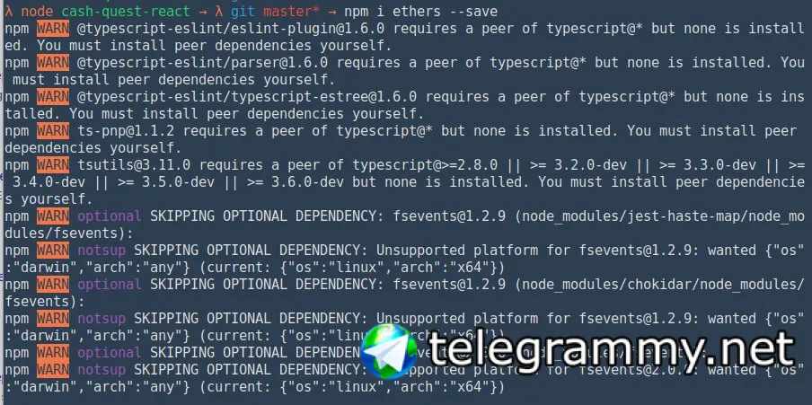 Мне нужно npm модуль ethers подключить к проекту на реакт. И есть пара вопросов. Проект создан с помощью CRA. Реакт сможет корректно подключить модуль без Browserify или нужно как-то шаманить? И еще, при установке модуля мне повылазили куча ошибок, я так понимаю дело в реакте. Мне нужно установить все эти тайпскрипт модули?