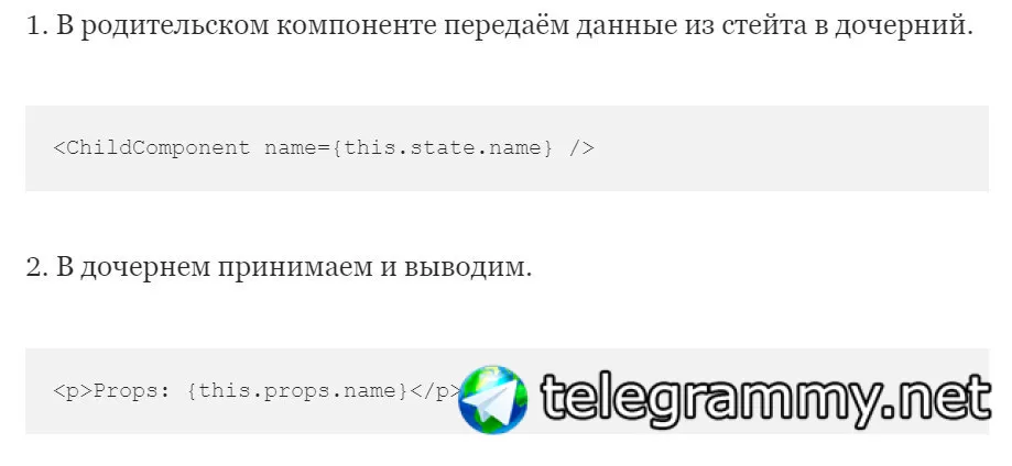 https://medium.com/@jmuse/%D0%BF%D0%B5%D1%80%D0%B5%D0%B4%D0%B0%D1%87%D0%B0-%D0%B4%D0%B0%D0%BD%D0%BD%D1%8B%D1%85-%D0%BC%D0%B5%D0%B6%D0%B4%D1%83-%D0%BA%D0%BE%D0%BC%D0%BF%D0%BE%D0%BD%D0%B5%D0%BD%D1%82%D0%B0%D0%BC%D0%B8-%D0%B2-react-d86394da2b50 (Родитель ➡️ Ребенок)