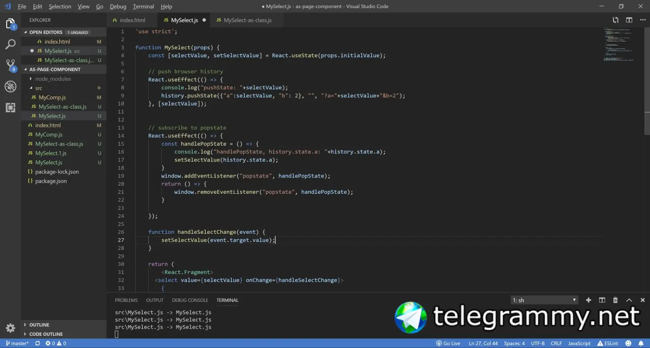 С отправкой значения селекта в УРЛ всё получилось несложно: в useEffect (componentDidMount/DidUpdate) пишу history.pushState и беру значение селекта из state компонента.