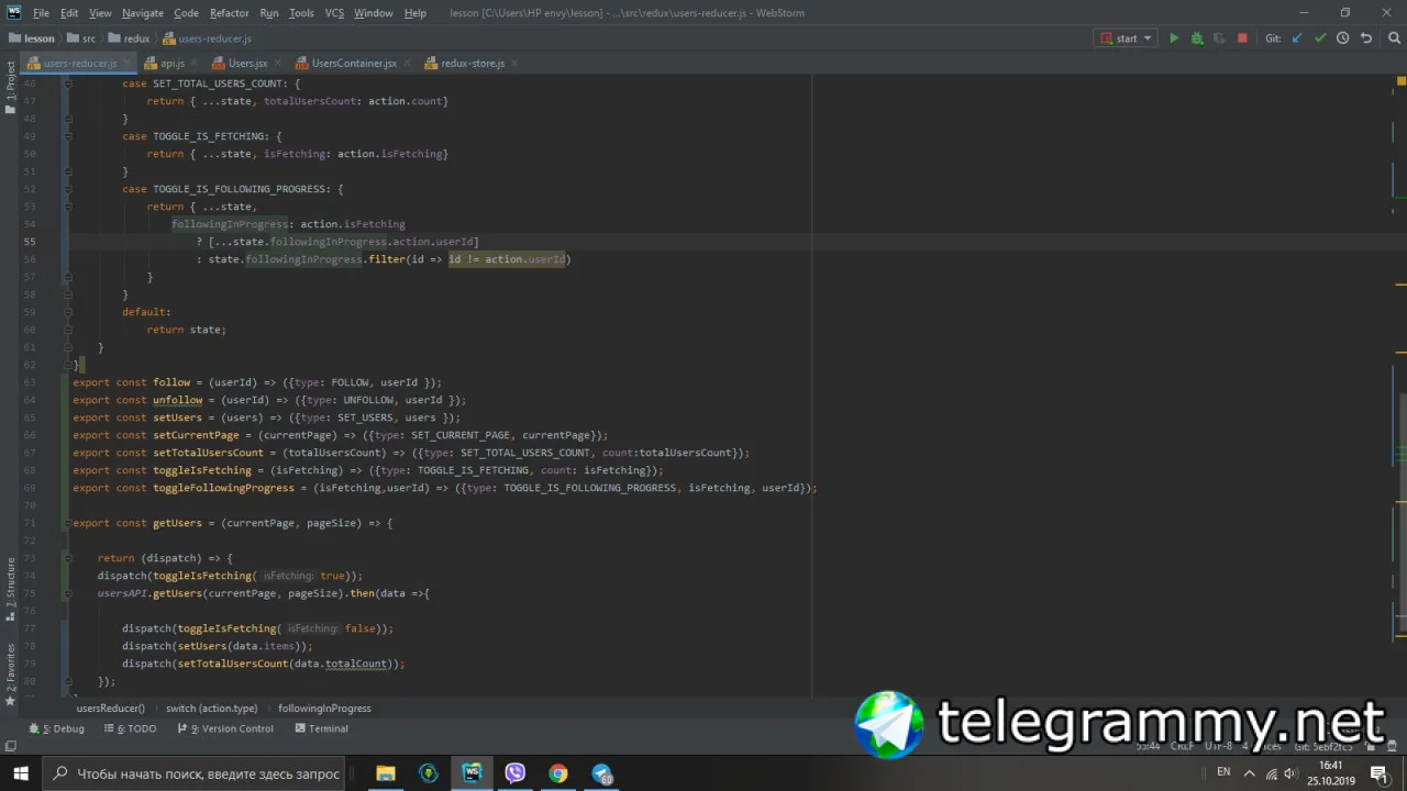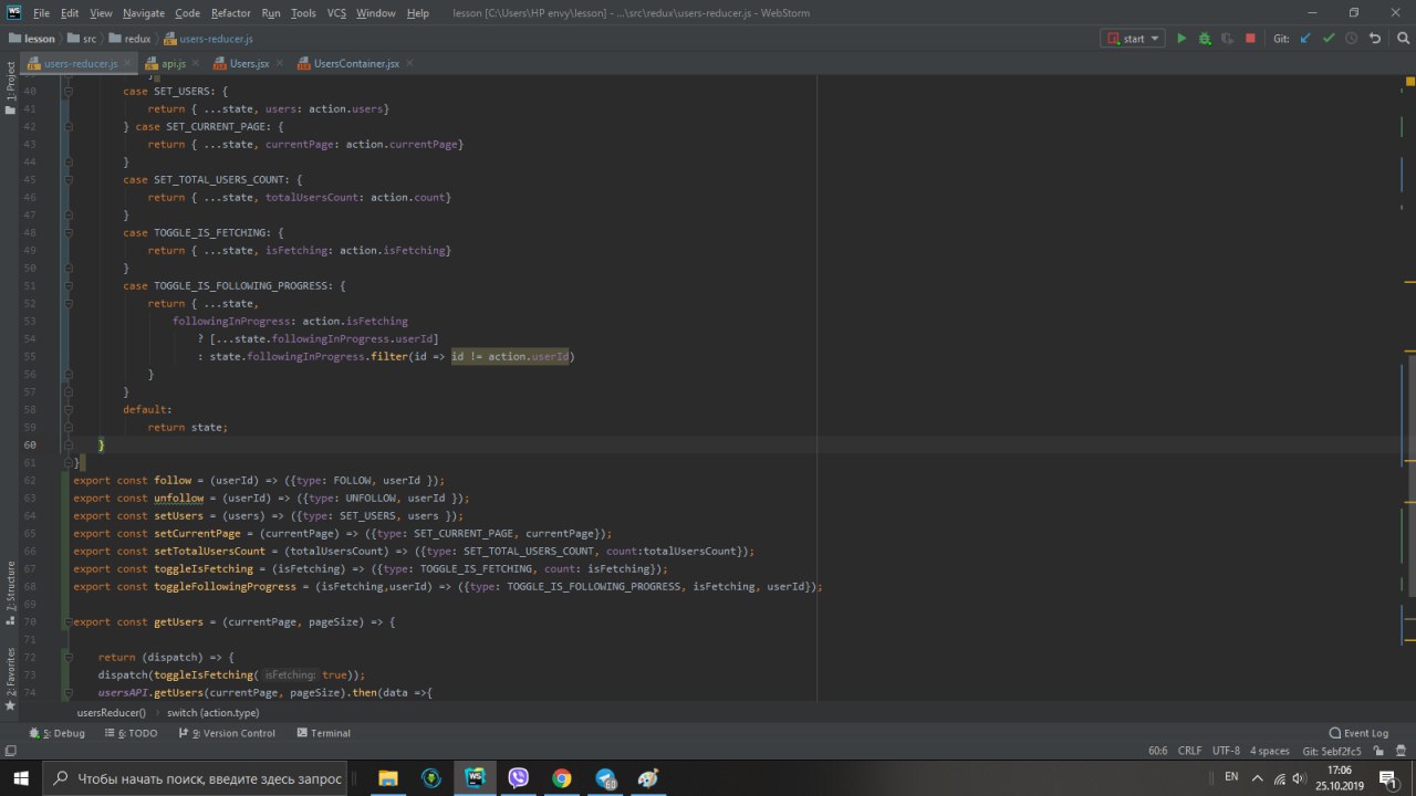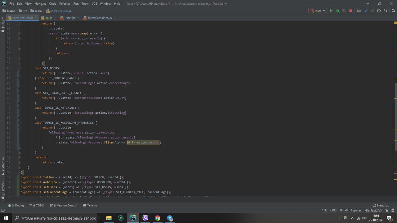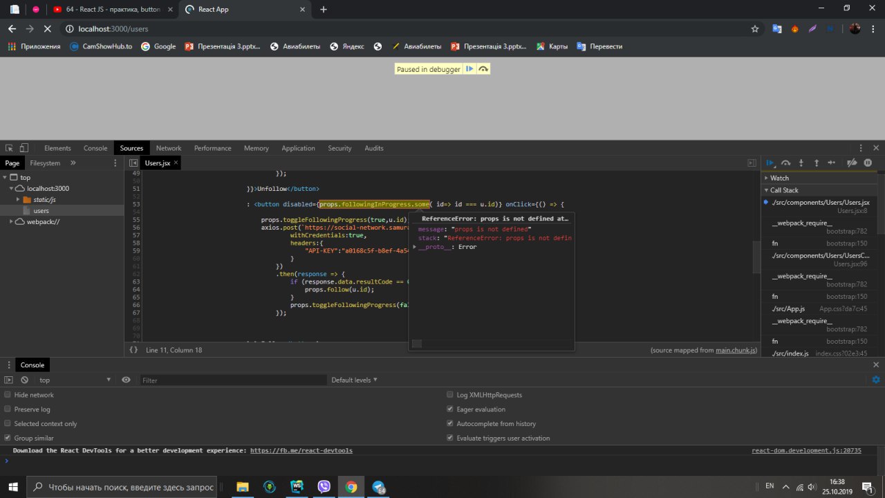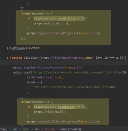 там где компонента Users (первый скрин). Поставь дебаггер и посмотри, что у тебя в followinginProgress