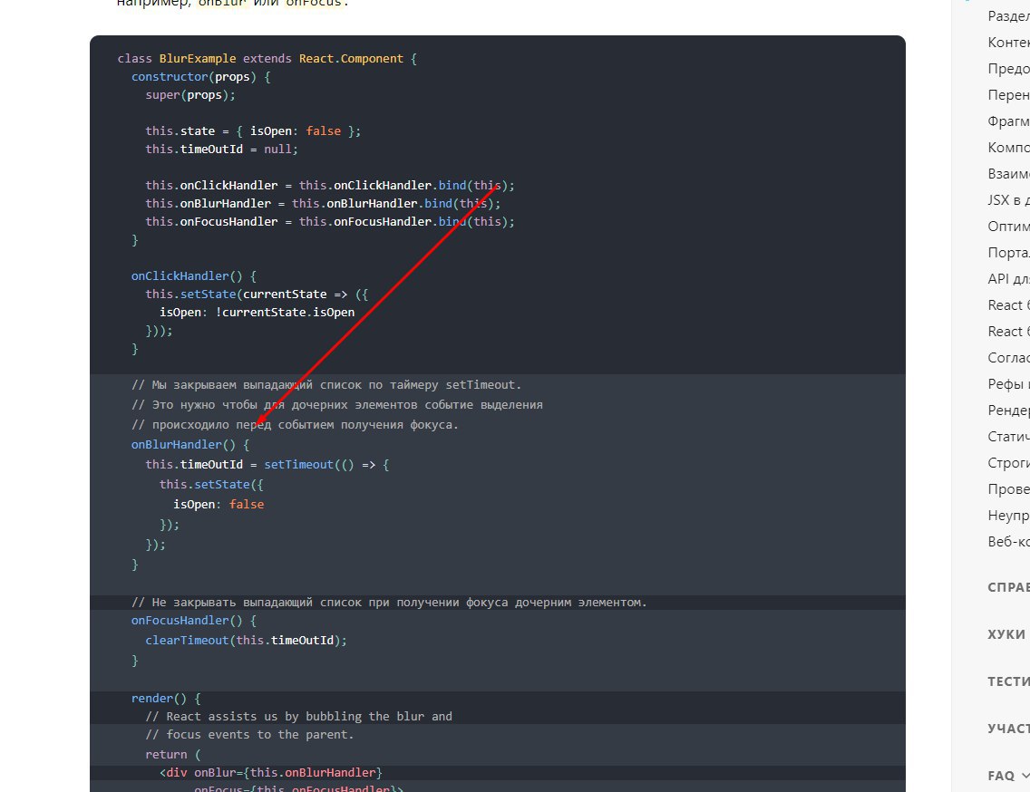 Привет всем, подскажите пожалуйста как работает маленькая деталь этой штуки, читал доку, именно эту страницу https://ru.reactjs.org/docs/accessibility.html Встретил такой момент и не понял почему мы добавляем здесь setTimeout, если бы вутри былабы сихронная операция, то все понятно но внутри setState это асинхронная и зачем нам там два асинхронна