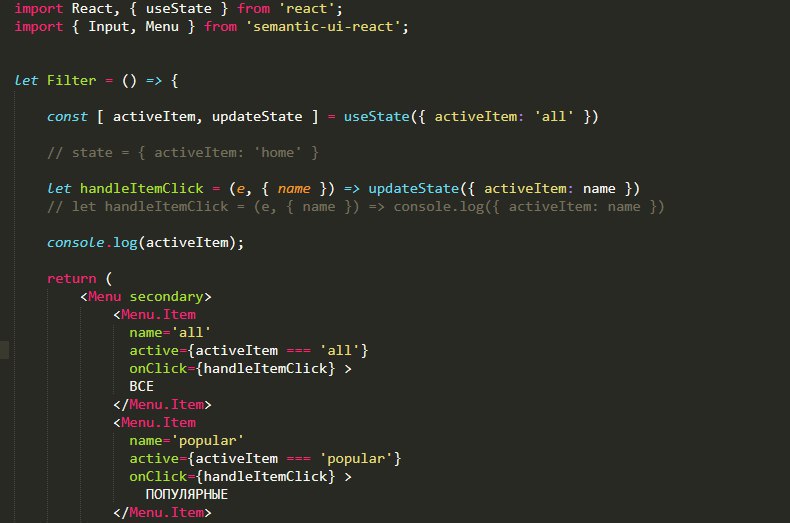 Кто может подсказать, использую react semantic ui и беру оттуда компонен, он классовый с состоянием, я переписываю функциональным с хуками, но не работает, что не так ? При клике должен выбераться один из пунктов (все, популярные, итд), в консоле activeItem меняется.
