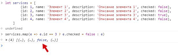services.map(e => e.id == action.id ? e.checked = action.checked : e) - тут возвращается либо e.checked, либо е