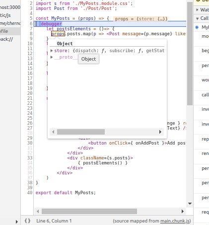 Тогда такой вопрос: при дебаггинге в Chrome навожу курсор на нужный элемент (props, posts и пр) и ничего не показывается. там же должно показываться значение во всплывающем облачке