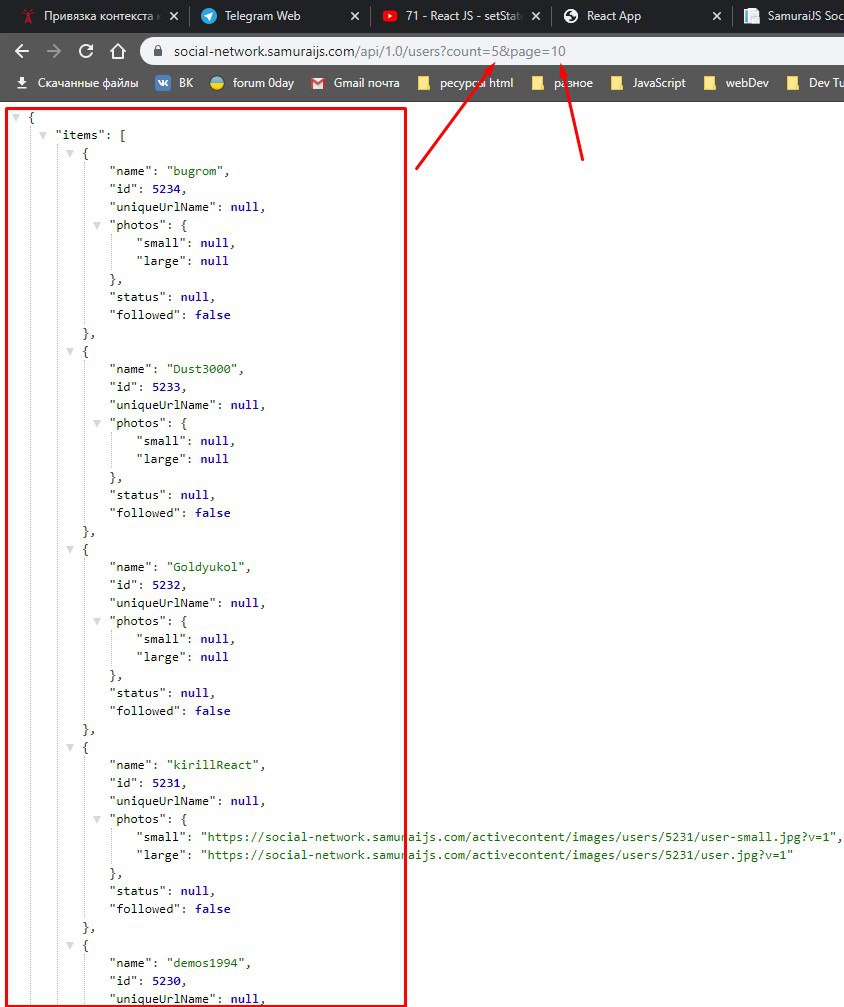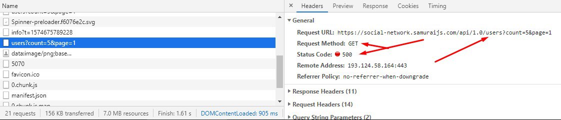 у мня грузит сам сайт норм. но вот почему по : https://social-network.samuraijs.com/api/1.0/users?count=5&page=10 приложуха выбрасывает 500ю ещё нужно думать. Всё работало... вот в том дело