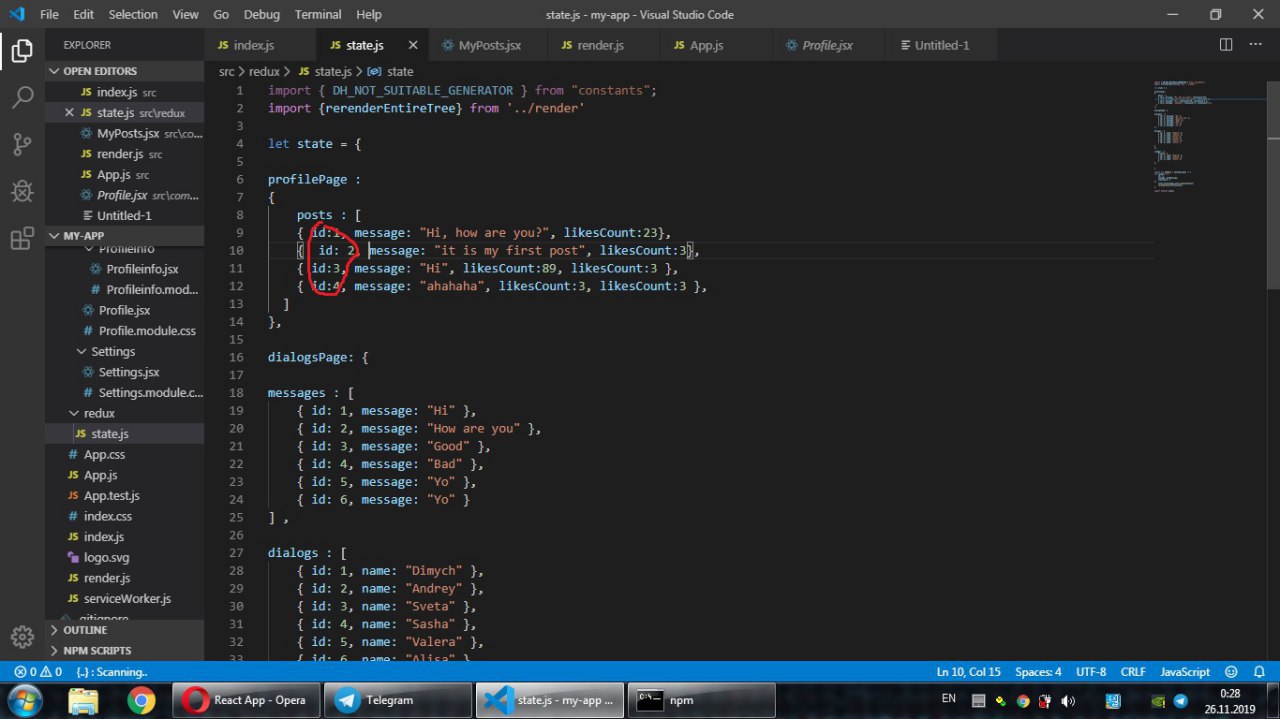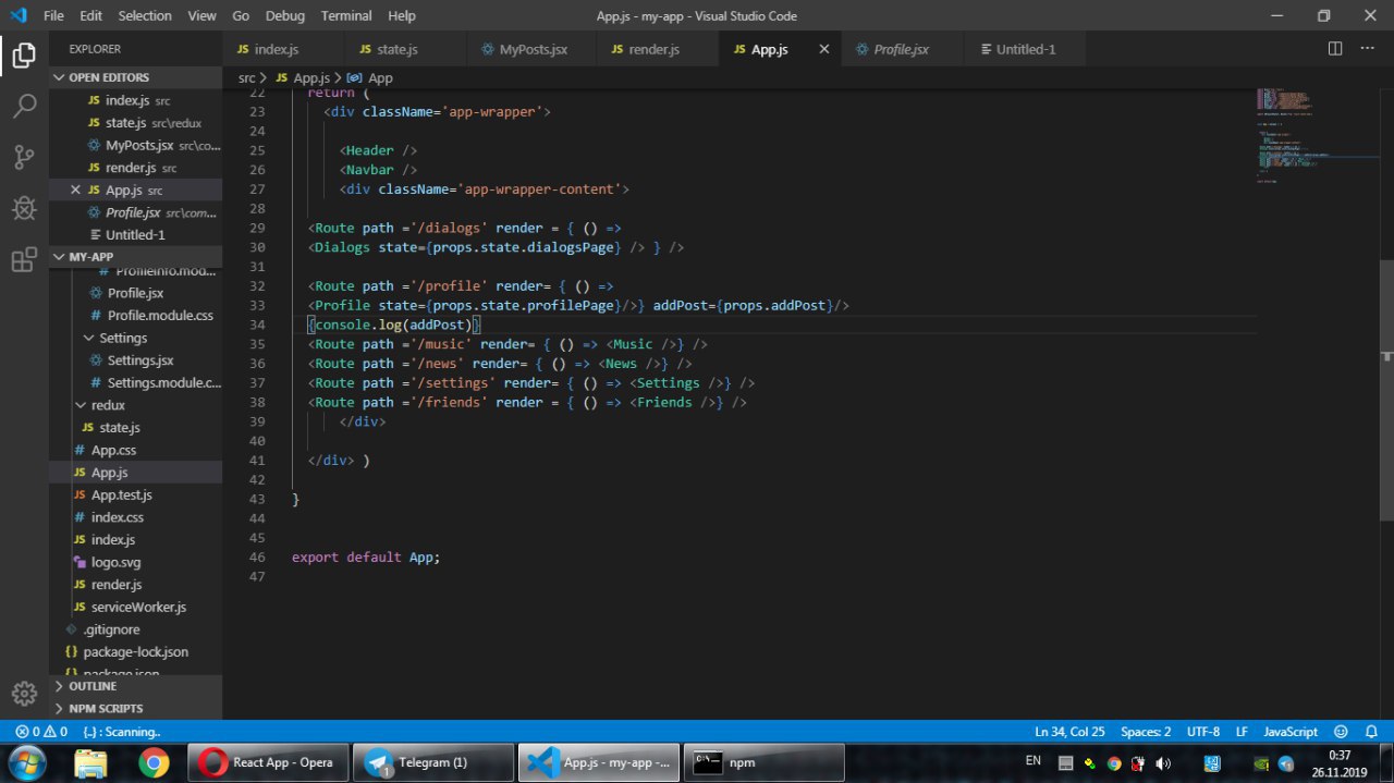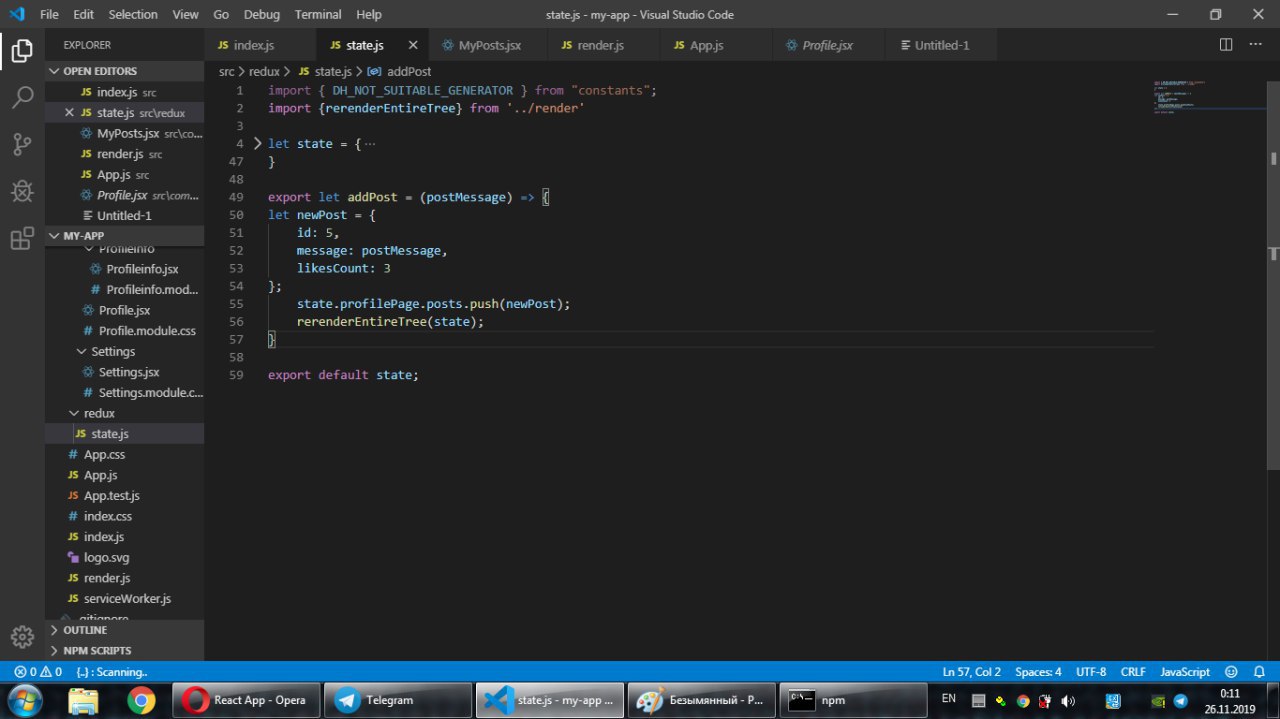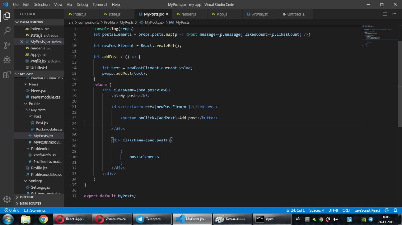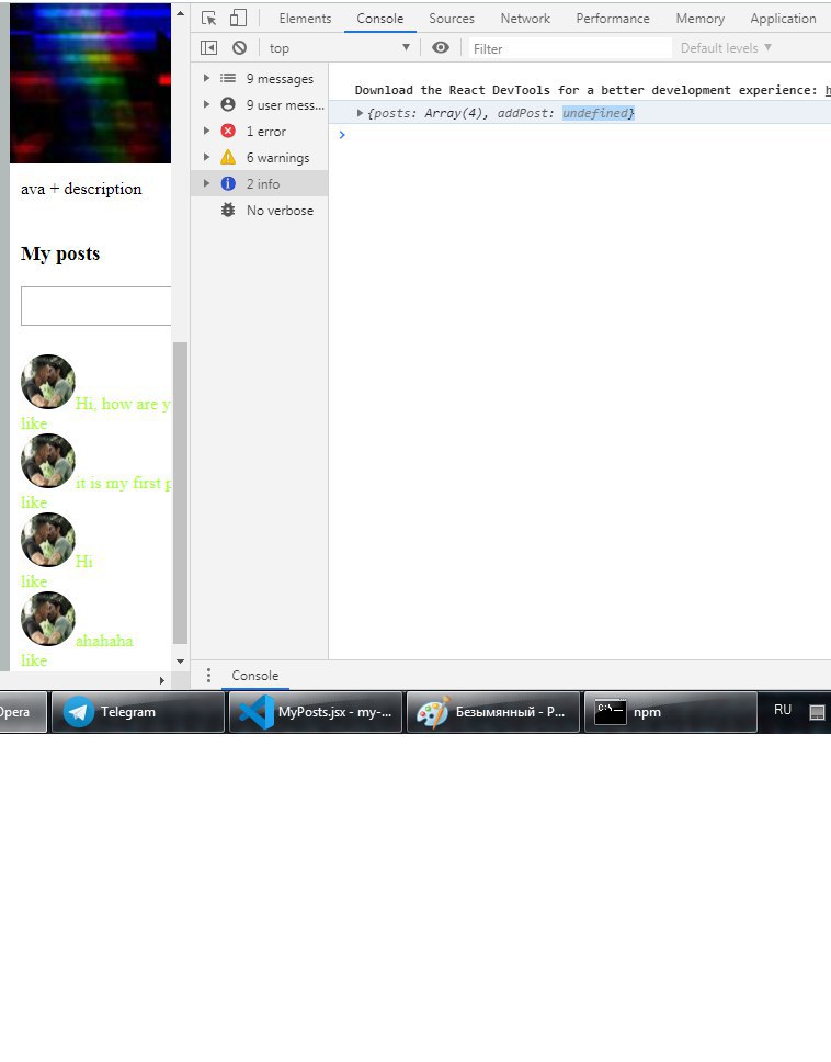 Точнее addPost=(props.addPost} перенес в profile rkvgjytyne