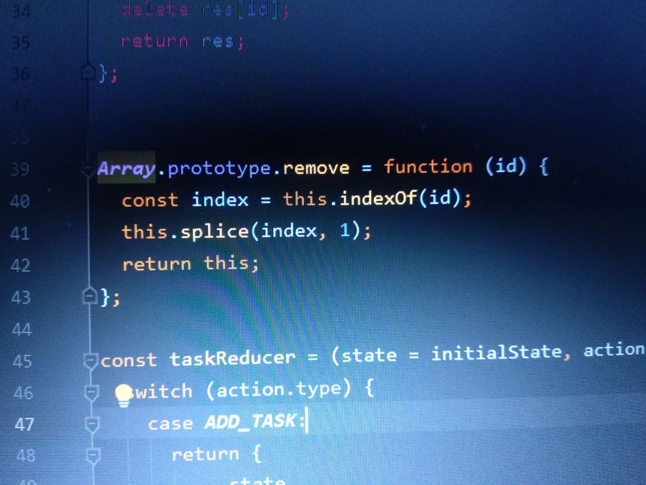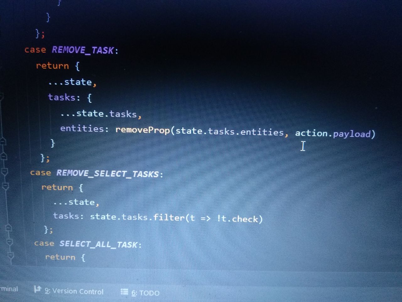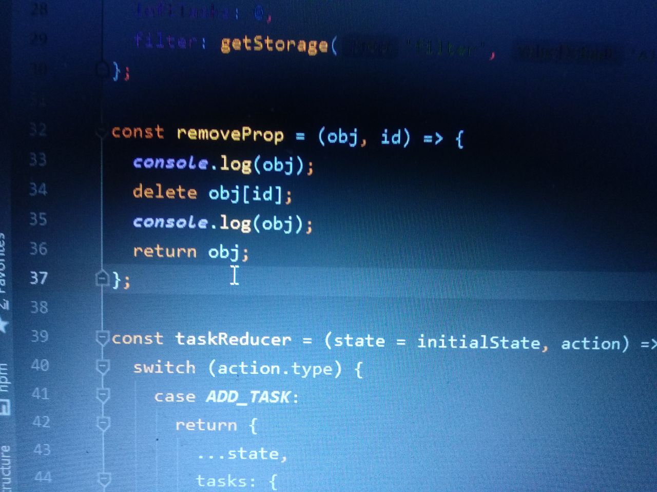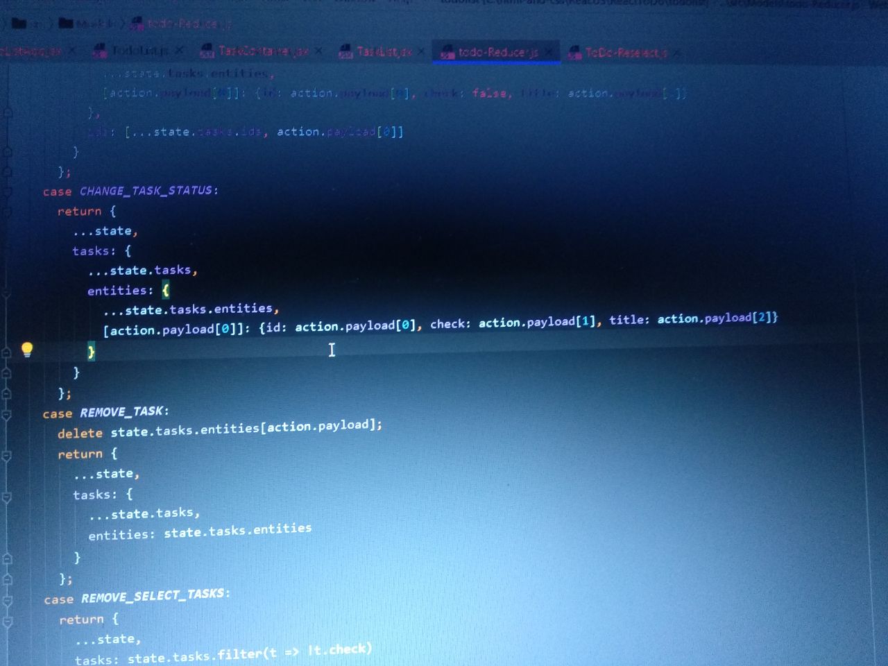 Да, я делал это перед ретерном, таким образом все работает, но нет реакции, из-за чего нет перерисовки, а если делать это в ретерне, т.е. что-то типо tasks: {...state.tasks, entities : delete state.tasks.entities[action.payload] то в объект вместо удаления возвращается true