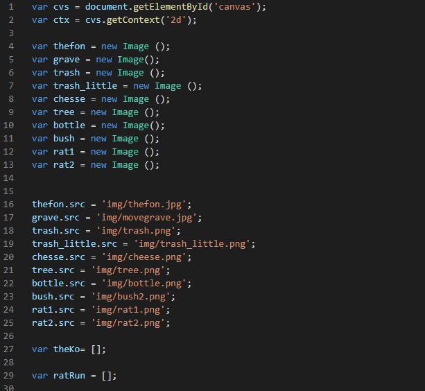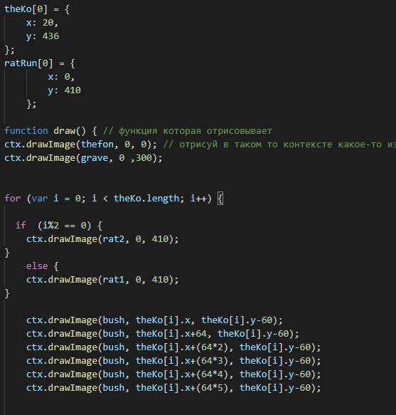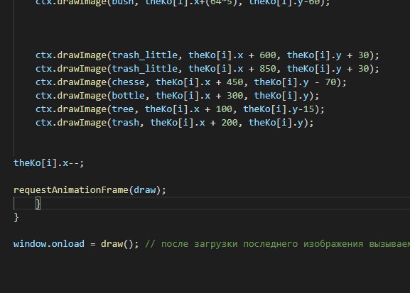 Есть раннер, крыса бежит по городу и ей навстречу попадаются препятствия, видела примеры раннеров и там запускается цикл, в котором отрисовываются элементы по очереди, и так по кругу каждый раз смещая кординату на одну назад, в итоге получается эффект движения. Так вот тут у меня движутся препятствия, но также я хотела чтобы картинка анимировалась, то есть добавить движение ног, и дописала внутрь цикла условие i%2==0, чтобы две картинки крысы по очереди вызывались, но цикл для крысы почему-то не работает(