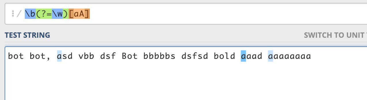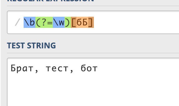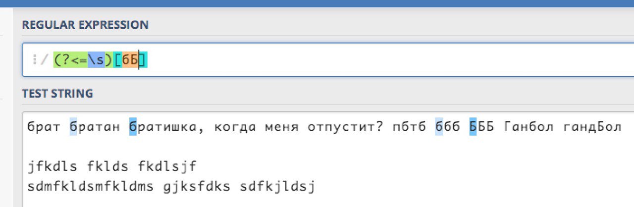 ✋, кто разбираеться в регулярках, делаю замену первого символа в словах, с англ символами работает все нормально, вписываю наши ничего /\b(?=\w)[бБ]
