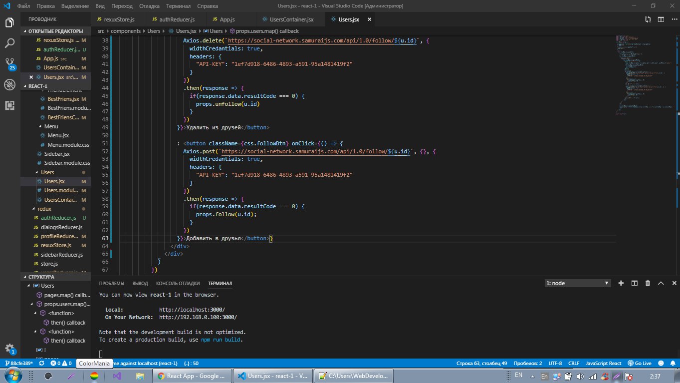 Хелп господа! 62 Урок. При попытке добавить в друзья юзера Аxios.post возвращает 401 статус. Не разрешает запрос.