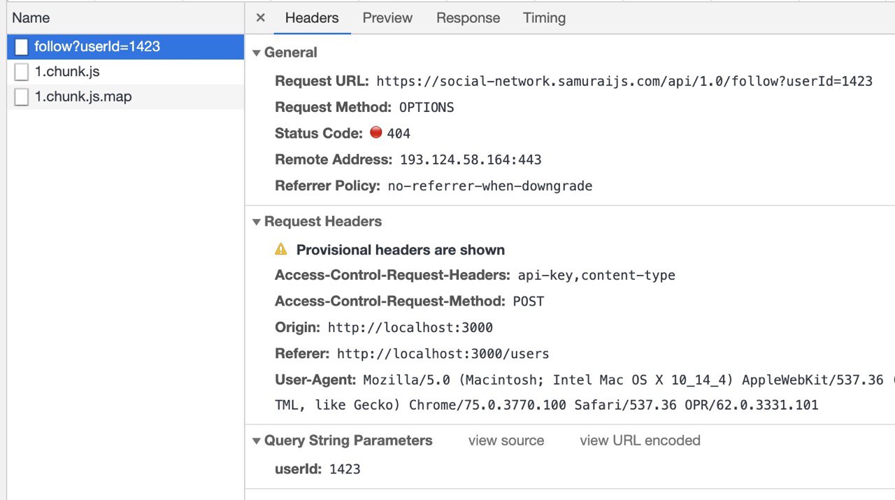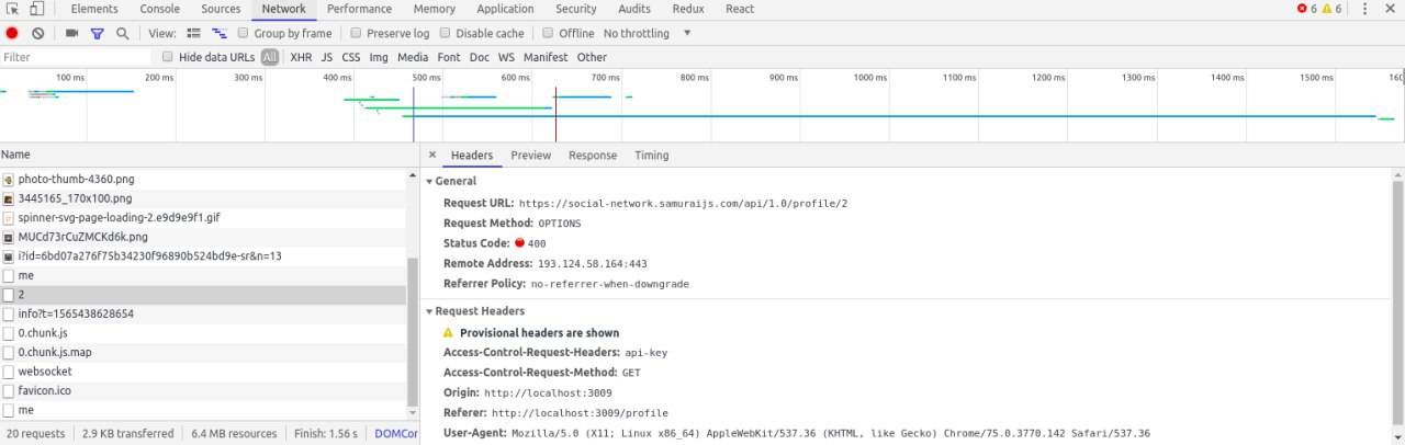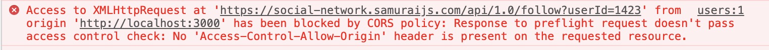 Доступ к XMLHttpRequest по адресу «https://social-network.samuraijs.com/api/1.0/profile/2» из источника «http: // localhost: 3009» заблокирован политикой CORS: Ответ на запрос предварительной проверки не выполняется пройти проверку контроля доступа: в запрашиваемом ресурсе отсутствует заголовок «Access-Control-Allow-Origin».