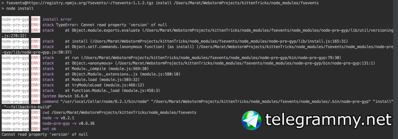 Ребята помогите не могу понять что происходит с компом, node, brew, все установленно, но когда npm install и вот выходит ошибка и незнаю что это ХЕЛП!