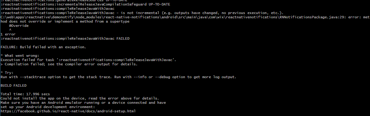 :reactnativenotifications:compileReleaseJavaWithJavac FAILED