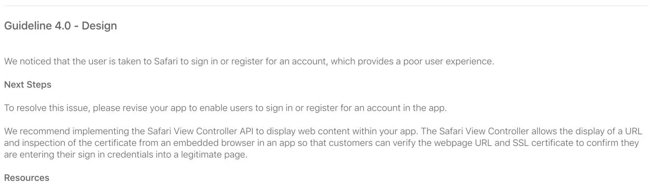 на ios за авторизацию через браузер сразу реджектнут