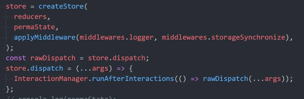 Вооще, не уверен что это что-то даст, я думал, что для этого лучше юзать InteractionManager и runAfterInteractions. Но если хочется можно просто метод диспатча у стора монекейпатчить же.