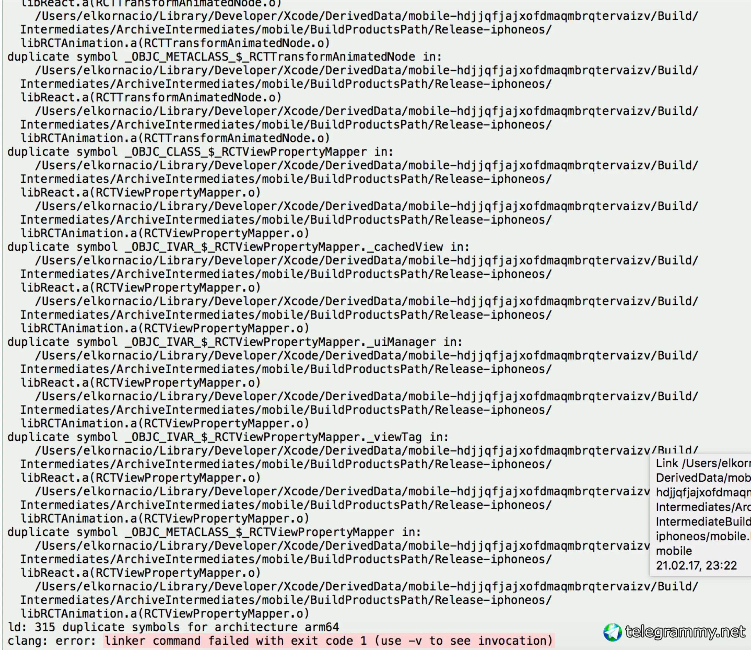 мб есть кто-то шарящий в xcode? я совершенно в нём не разбираюсь и причину такого конфликта прикинуть не могу (никаких либ по 2 раза подключающих реакт у меня нет), а проект нужно ппц срочно выкатывать