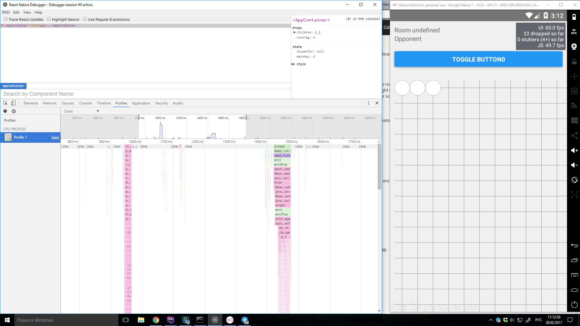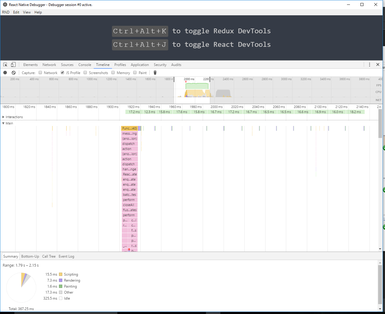 зеленая хрень в профайлере это обычно рендер или перерасчет лэйаута. хотя конечно в разрезе RN не очень понятно что это