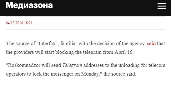 The source of "Interfax", familiar with the decision of the agency, said that the providers will start blocking the Telegram from April 16.