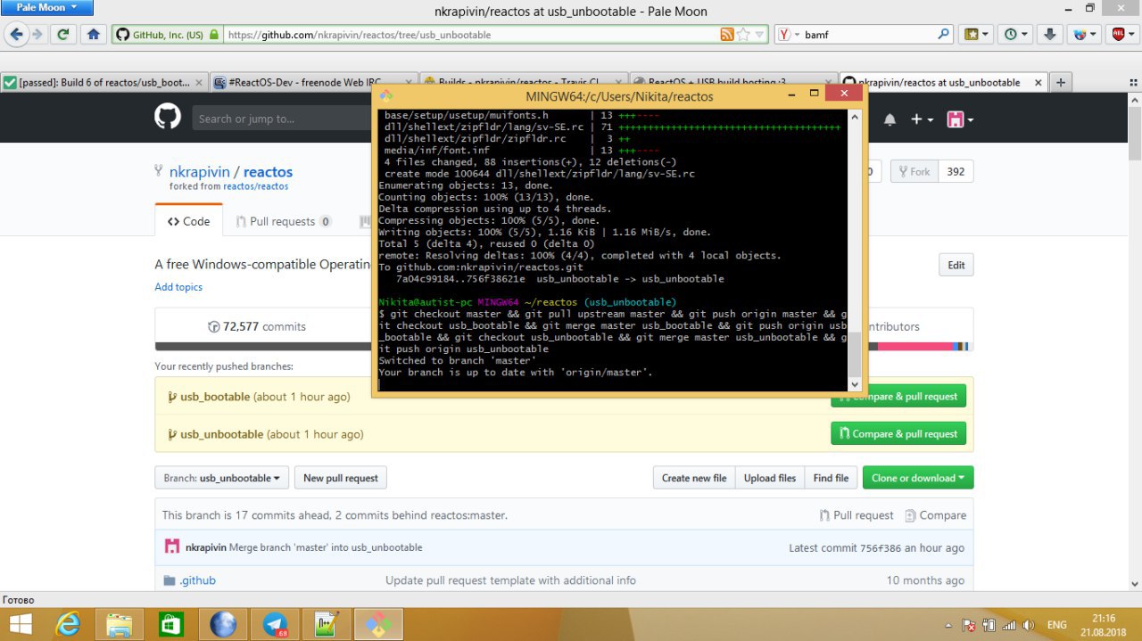 https://github.com/nkrapivin/reactos - usb_bootable and usb_unbootable branches.