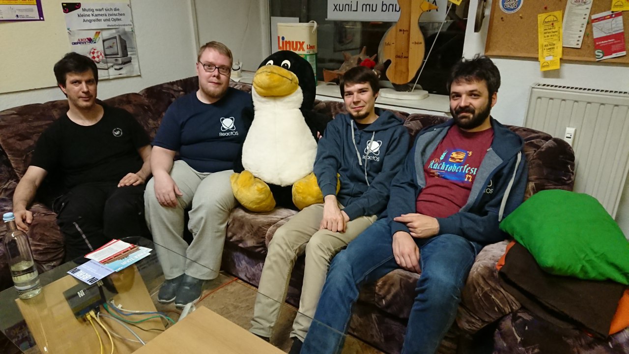 <Cernodile> Left to right: Timo Kreuzer, Stanislav Motylkov, Tux the Linux mascot, Victor Perevertkin, Mark Jansen