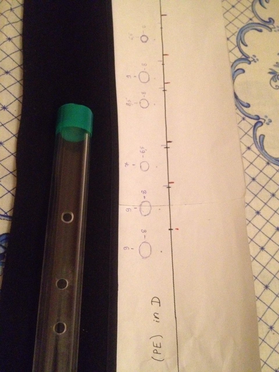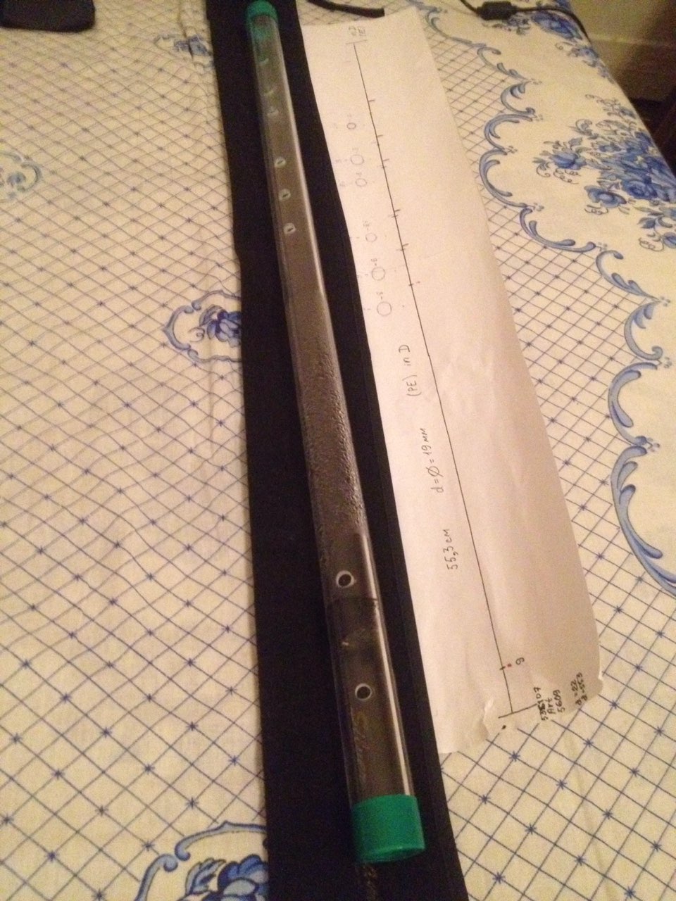 Сначало расстояния и резонансные точки вычислял, потом намечал маркером предполагаемые точки сверловки, потом проверял ( искал центр масс - с учетом сверловки ). Центр масс у этой флейты находится между двумя игровыми отверстиями те что ближе к духовому