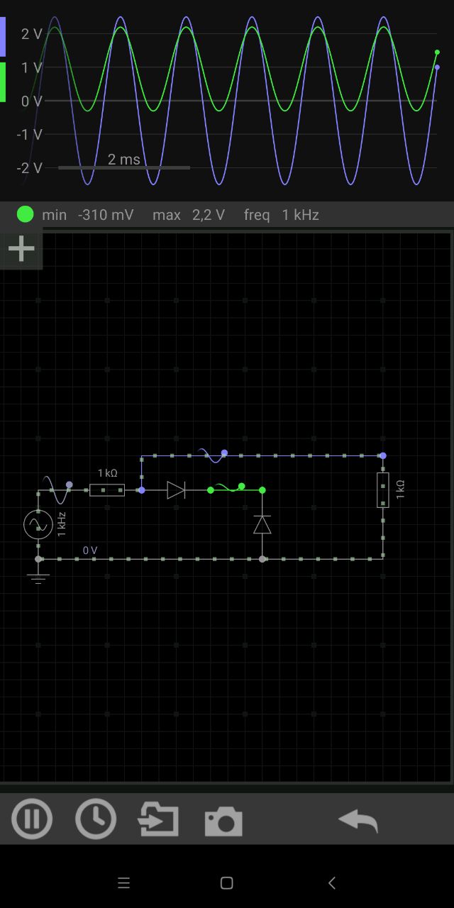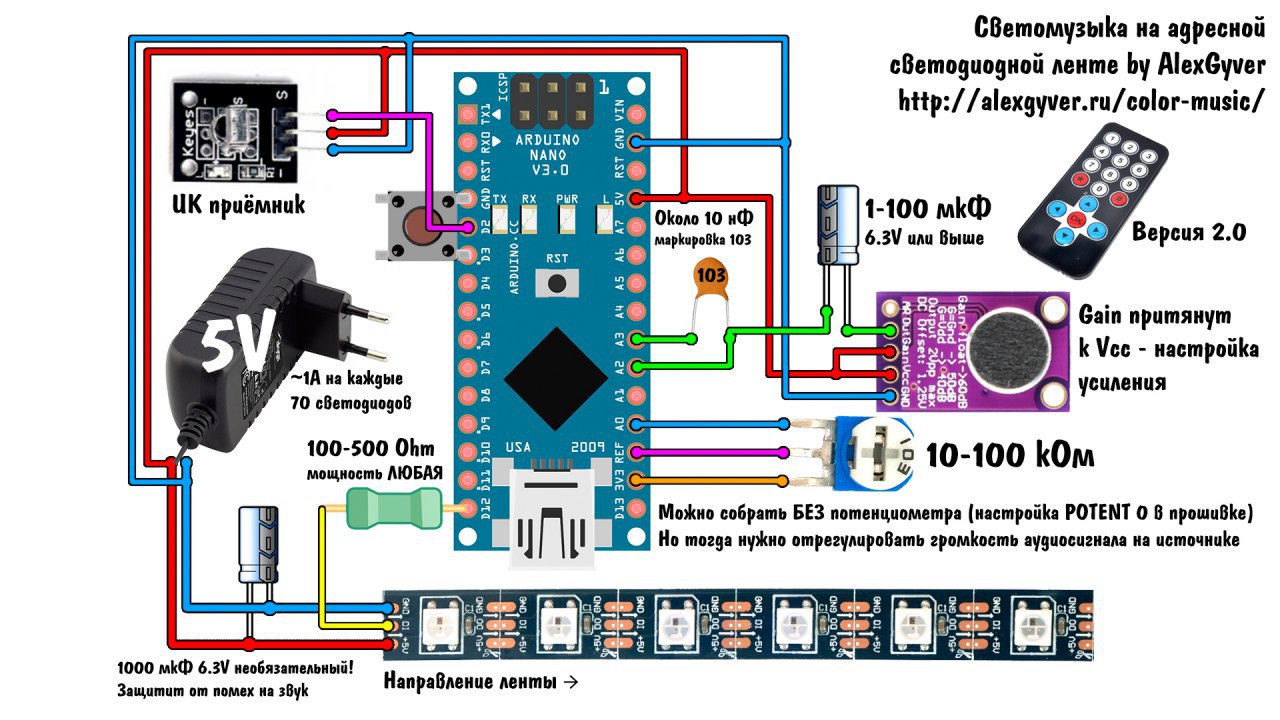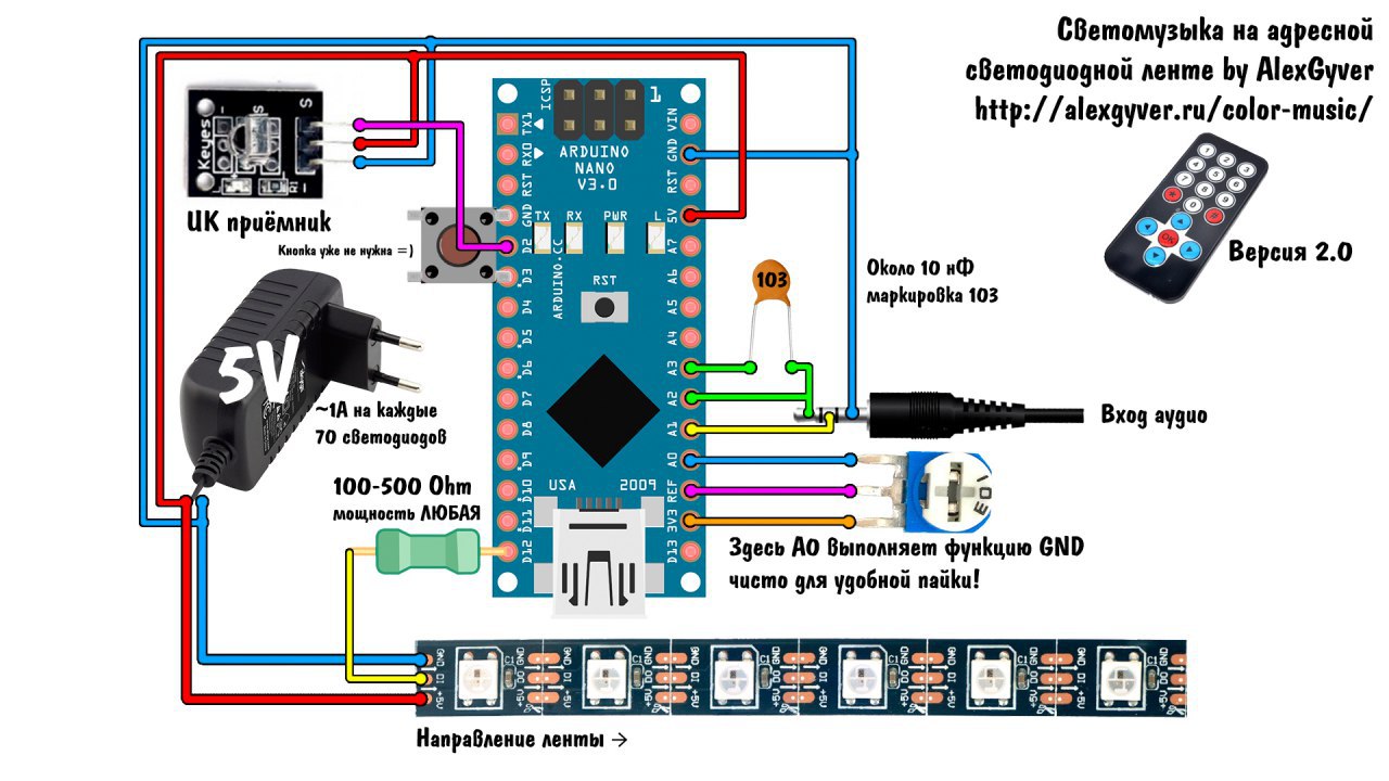 А теперь дальше. Есть у тебя земля, она общая и у звукового сигнала, и у микрухи U1. Когда верхний полупериод синусоиды - напряжение на пинах А1, А2 растет относительно земли, все ок. Когда нижний полупериод синусоиды - напряжение на пине идет в минус, а так нельзя. Допуск на то, сколько выдержит микруха напряжения ниже значения её земли указан в даташите. Конкретно в твоем случае источник сигнала слабый, получилась игра "кто сильнее - победил". Повезло тебе, что выиграла микруха U1 и просто исказила сигнал. А могла и дым пустить. В общем, паяй туда или резюки побольше и пусть работает как задумывалось, или диоды - сигнал на светомузыку исказит, да и хрен с ней, звук будет такой как должен быть.