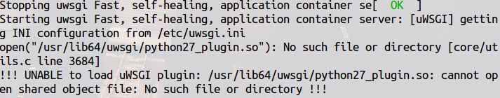 решением этого говна якобы является прописывание в инишке plugins=python27 и установка uwsgi-plugins-python и uwsgi-plugins-common