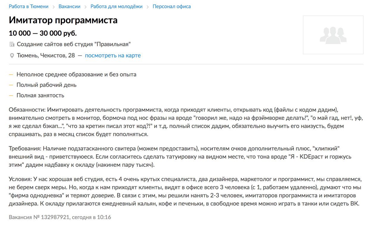 Кстати, я тут вам вакансию нашёл подходящую. Налетай!