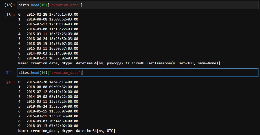 Всем привет! Может кто-нибудь сталкивался с такой проблемой. Делаю запросы с помощью sqlalchemy к базе PostgreSQL и datetime возвращается без таймзоны (UTC). Если делаю тот же запрос с помощью psycopg2, то возвращается всё норм. Не могу нигде найти понятного способа для коннекта sqlalchemy указать таймзону