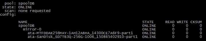 zpool attach spoolDB ata-MTFDDAK256MAY-1AH12ABHA_14300CE7A6F9-part1 /dev/disk/by-id/ata-SAMSUNG_MZ7LN256HCHP-000H1_S1ZPNXAG703906-part1