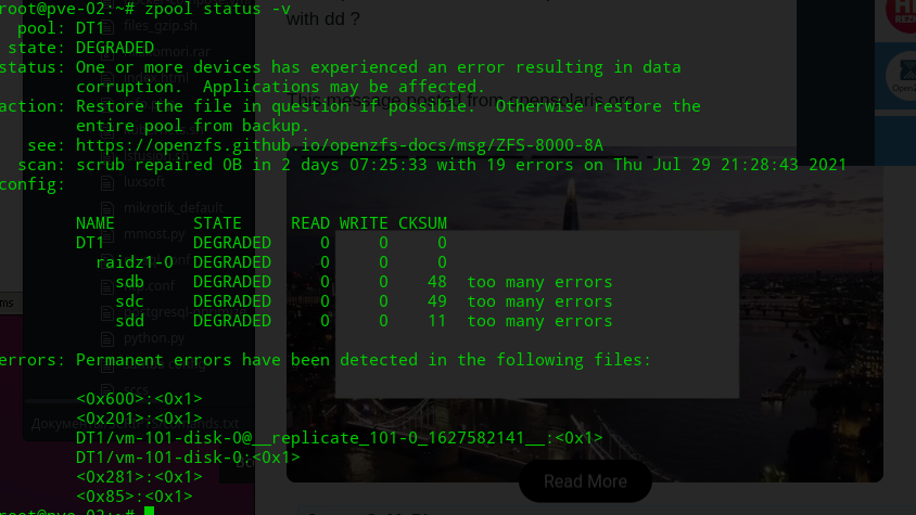 Предварительно повторилась проблема с вылетом ext4 over zvol в состояние RO, судя по zfs list осталось мало свободного места пуле/датасете.