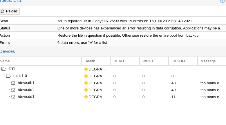 Скраб, как я вижу, не помогает. Тут остается сбросить счетчик ошибок и попробовать еще раз. Хотя если все диски сыплются, дело скверное..