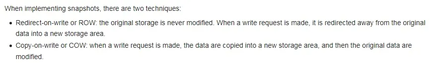 Redirect-on-write or ROW: the original storage is never modified. When a write request is made, it is redirected away from the original data into a new storage area.