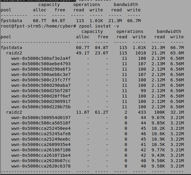 zfs 2.0.5, proxmox 6, первый диск разбит штатным инсталлятором системы, второй отдан целиком zfs-у, на третьем создан отдельный раздел (-1 Gb от общего объёма) и zfs-у отдан только этот раздел.